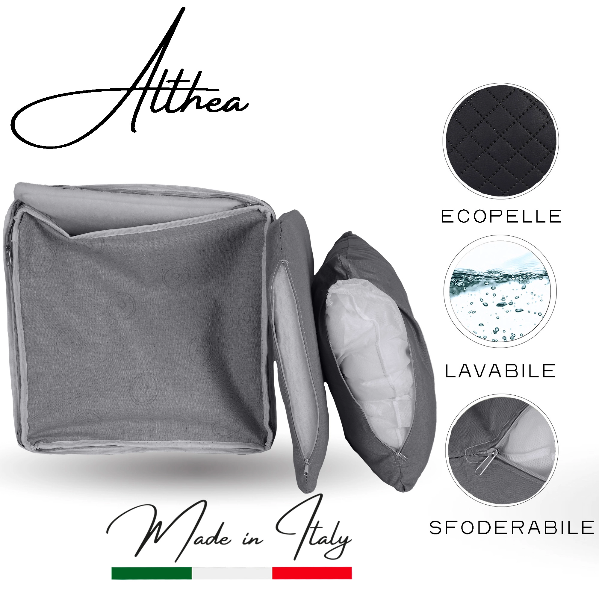 • Sfoderabile, sul fondo e sui 2 cuscini