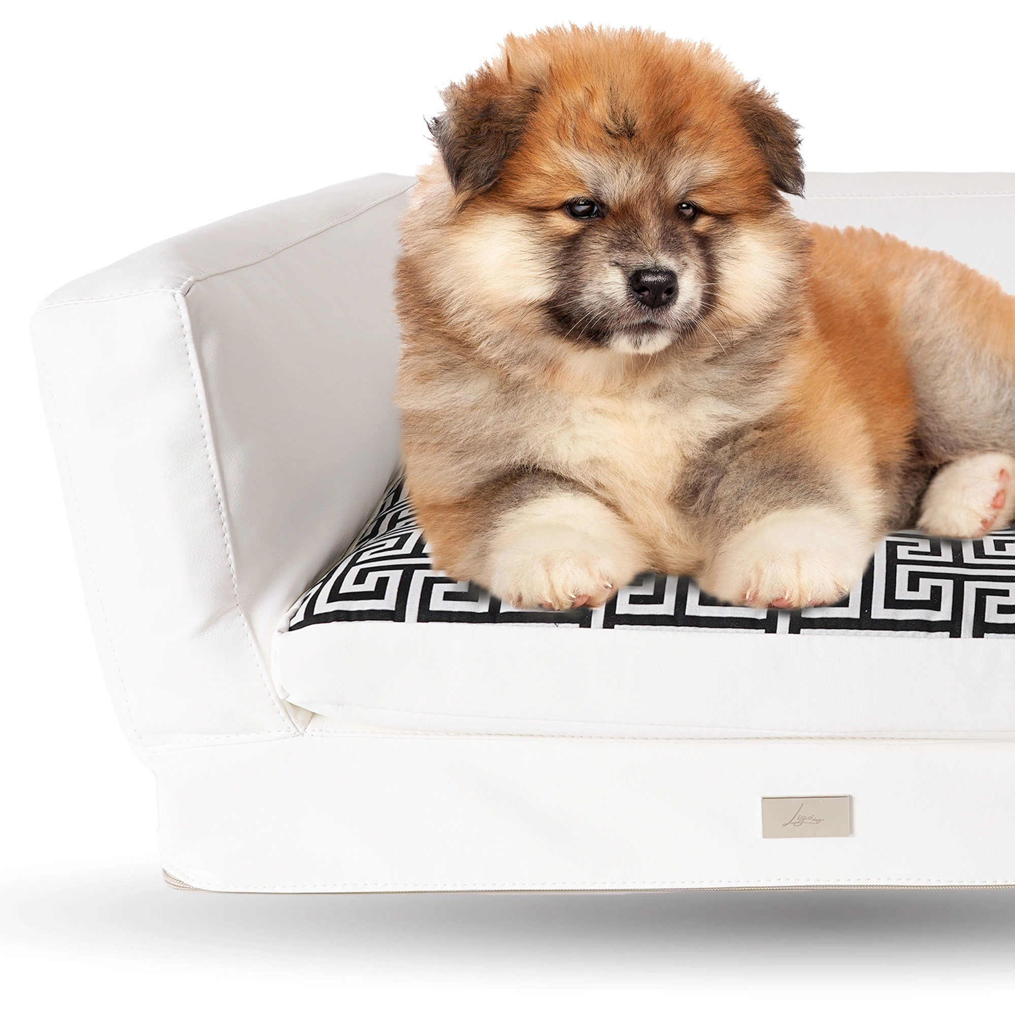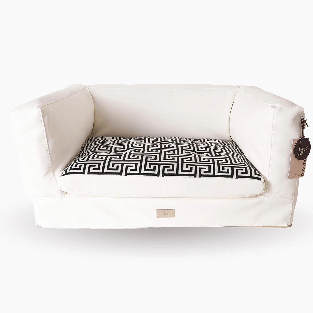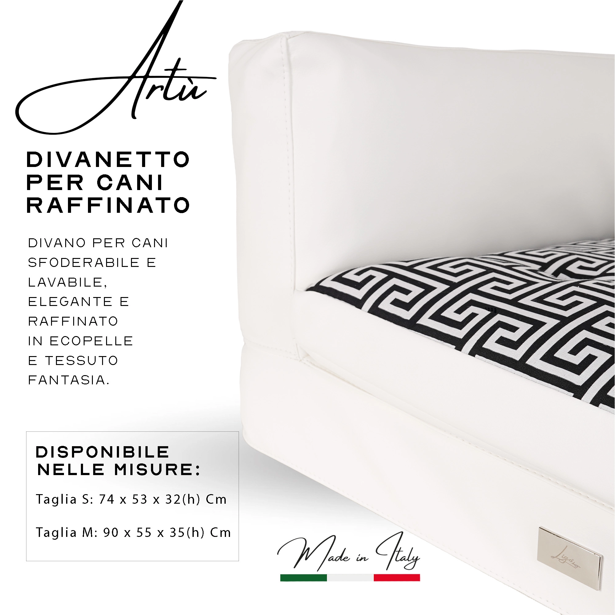 Divanetto super confortevole, con targhetta in metallo.