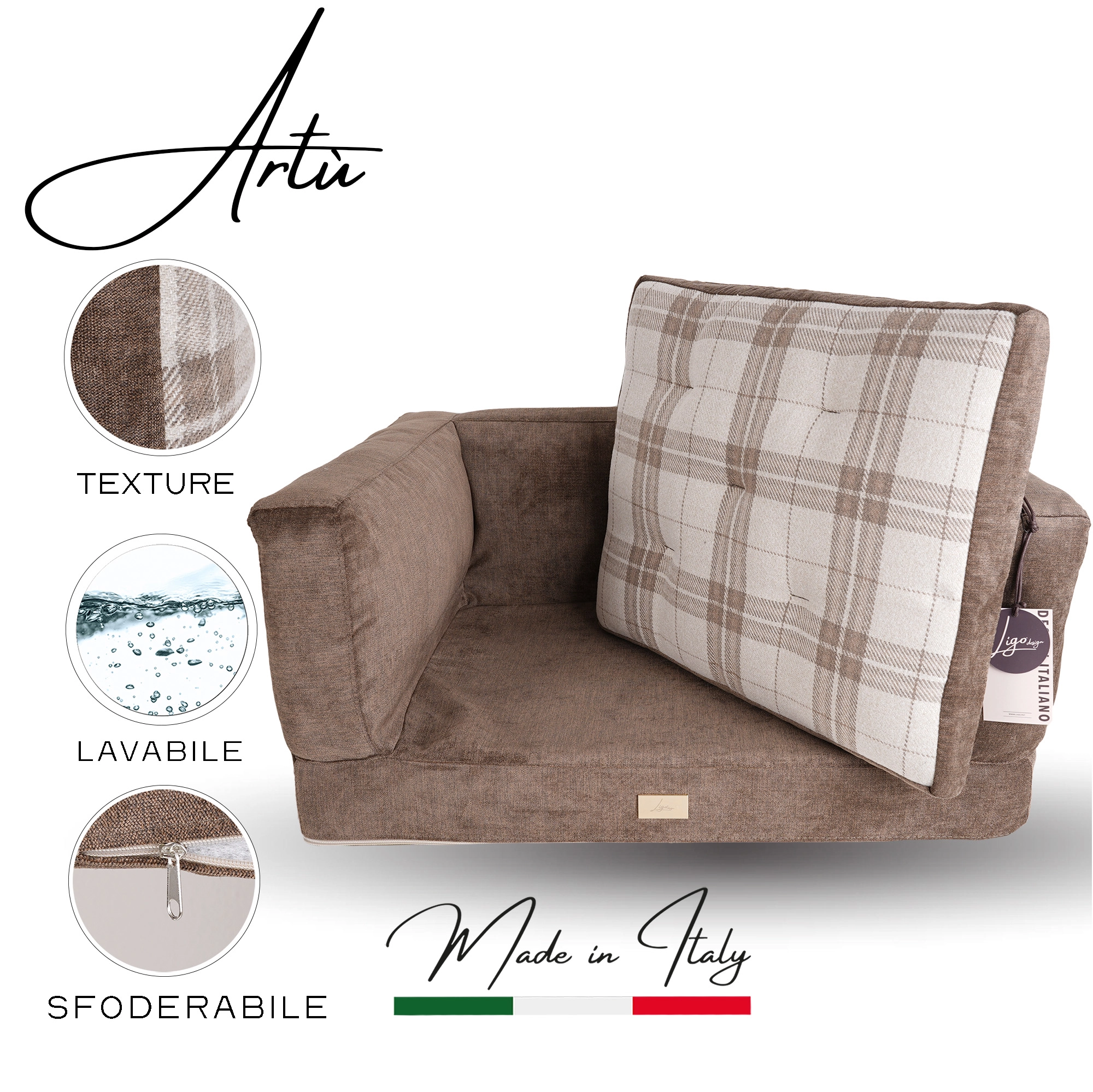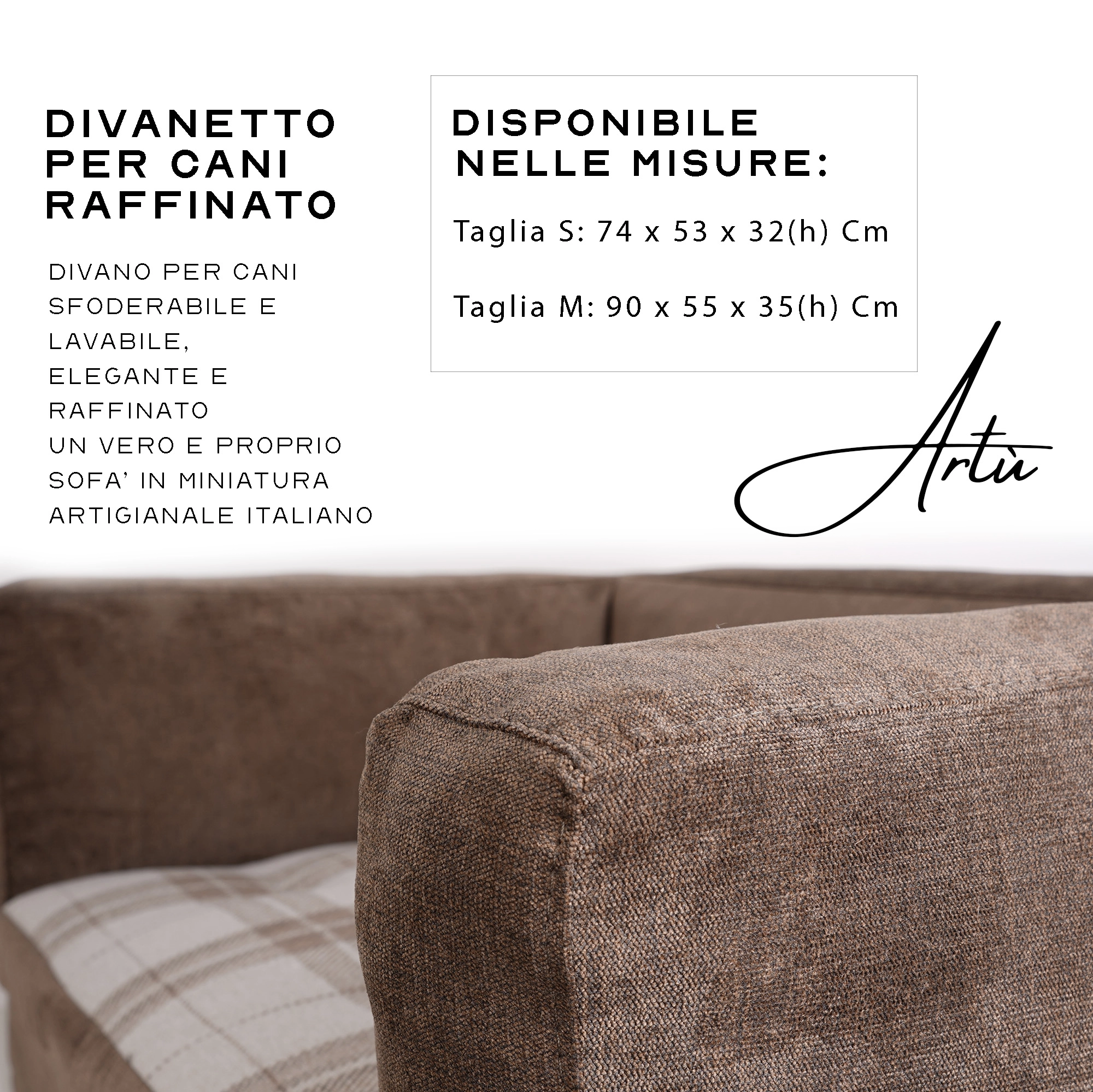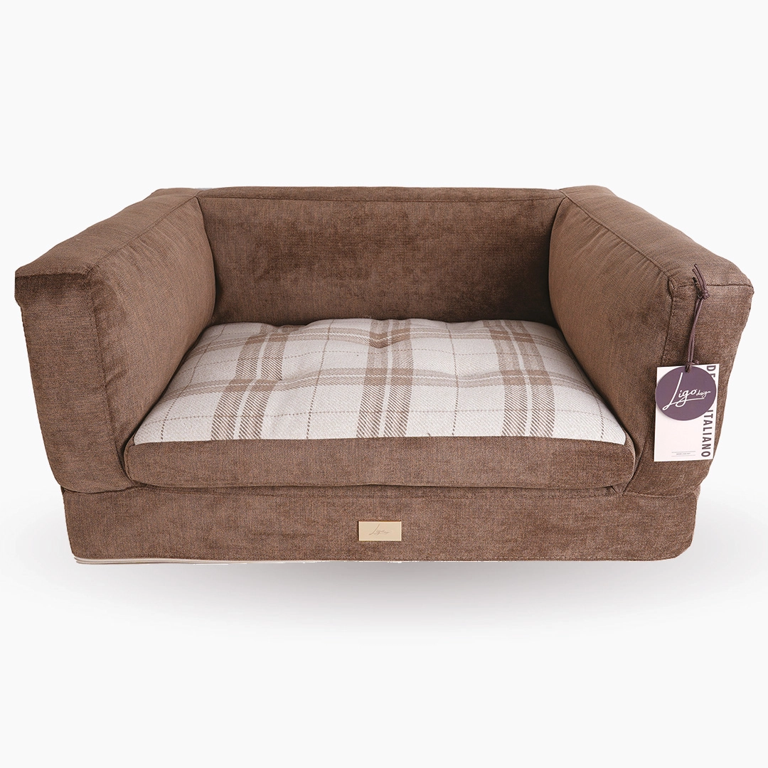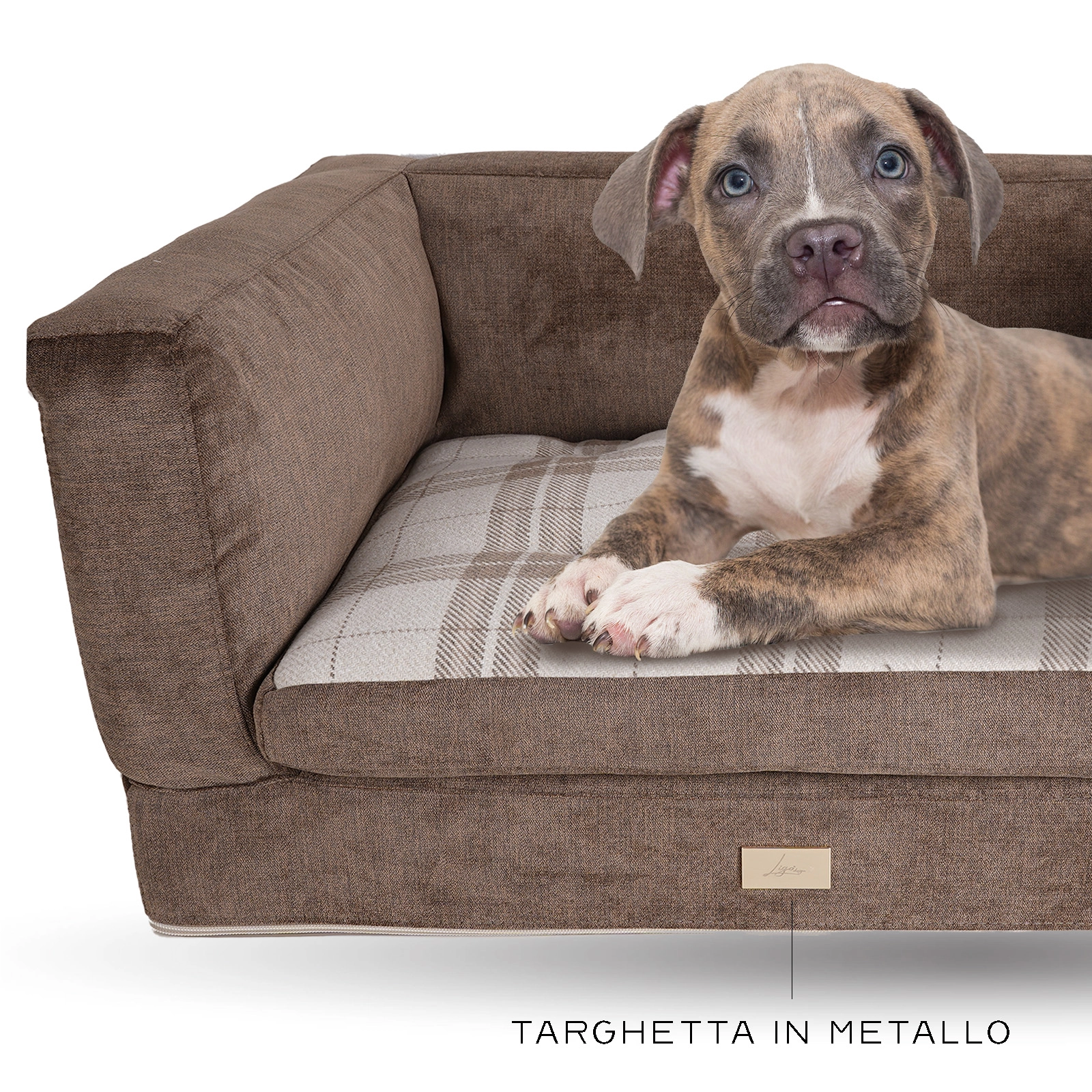 Divanetto super confortevole, con cuscino scozzese e targhetta in metallo.