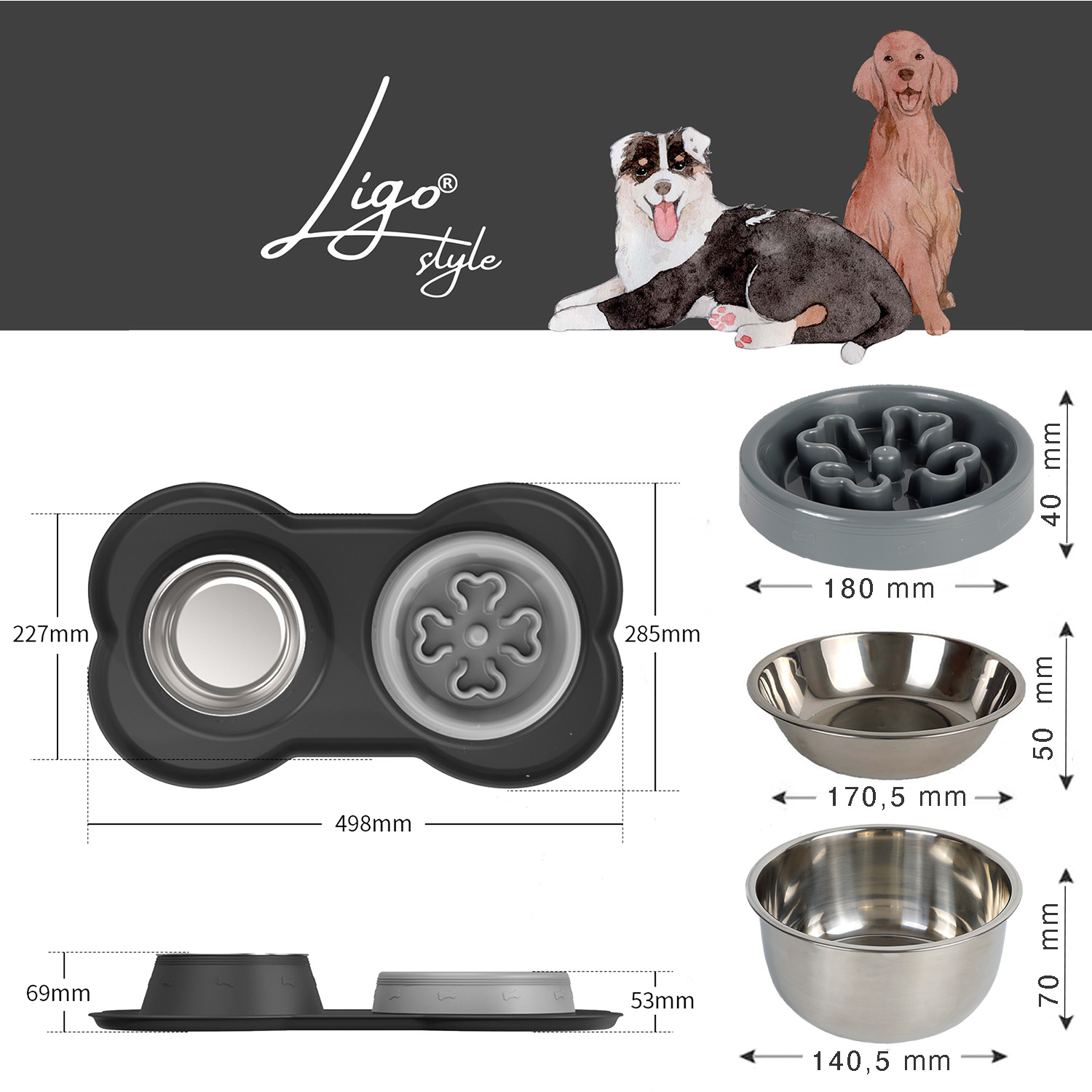 Ciotola doppia pensata ad un’alimentazione lenta. Funzionale come pasto completo (cibo, acqua) o entrambi. Ideale per cani di media e grande taglia.