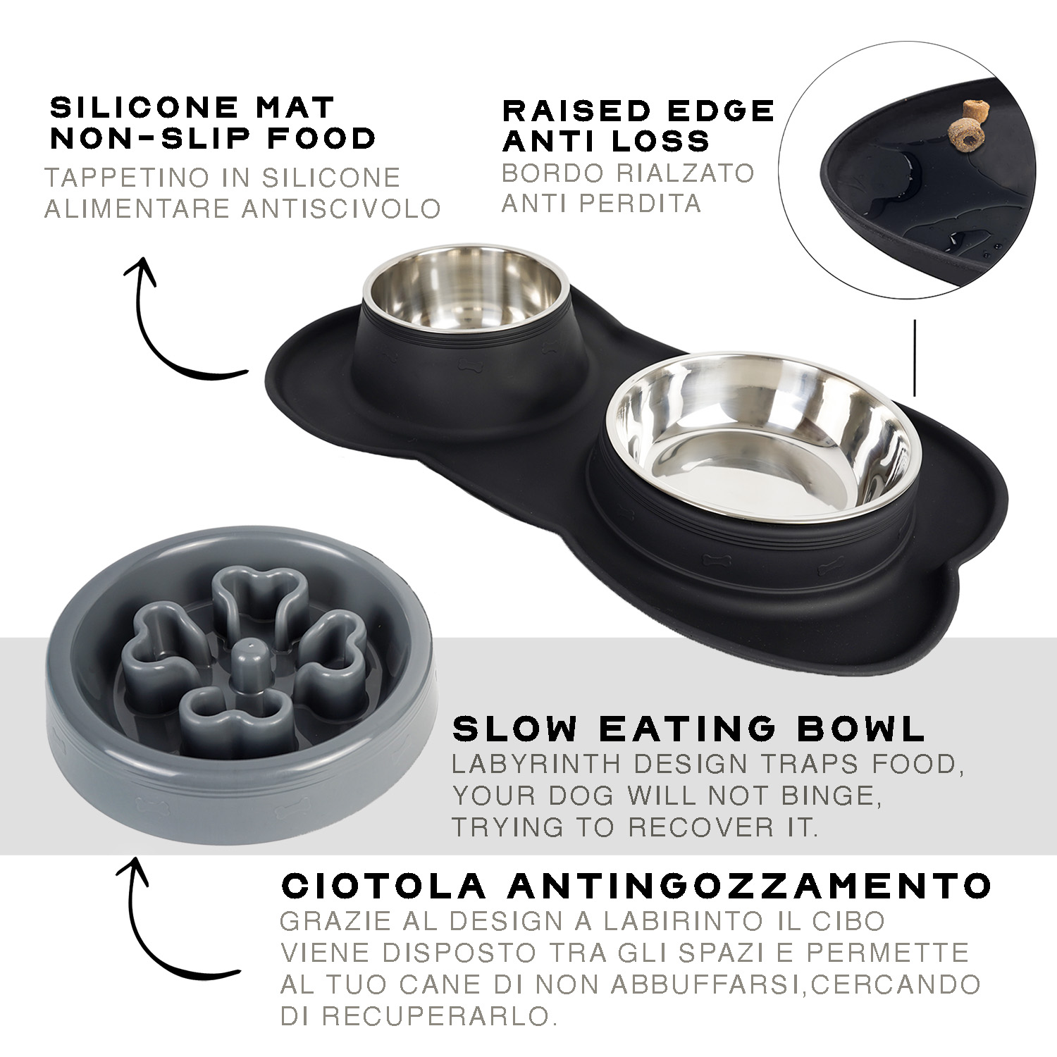Ciotola doppia pensata ad un’alimentazione lenta. Ideale per cani di media e grande taglia.