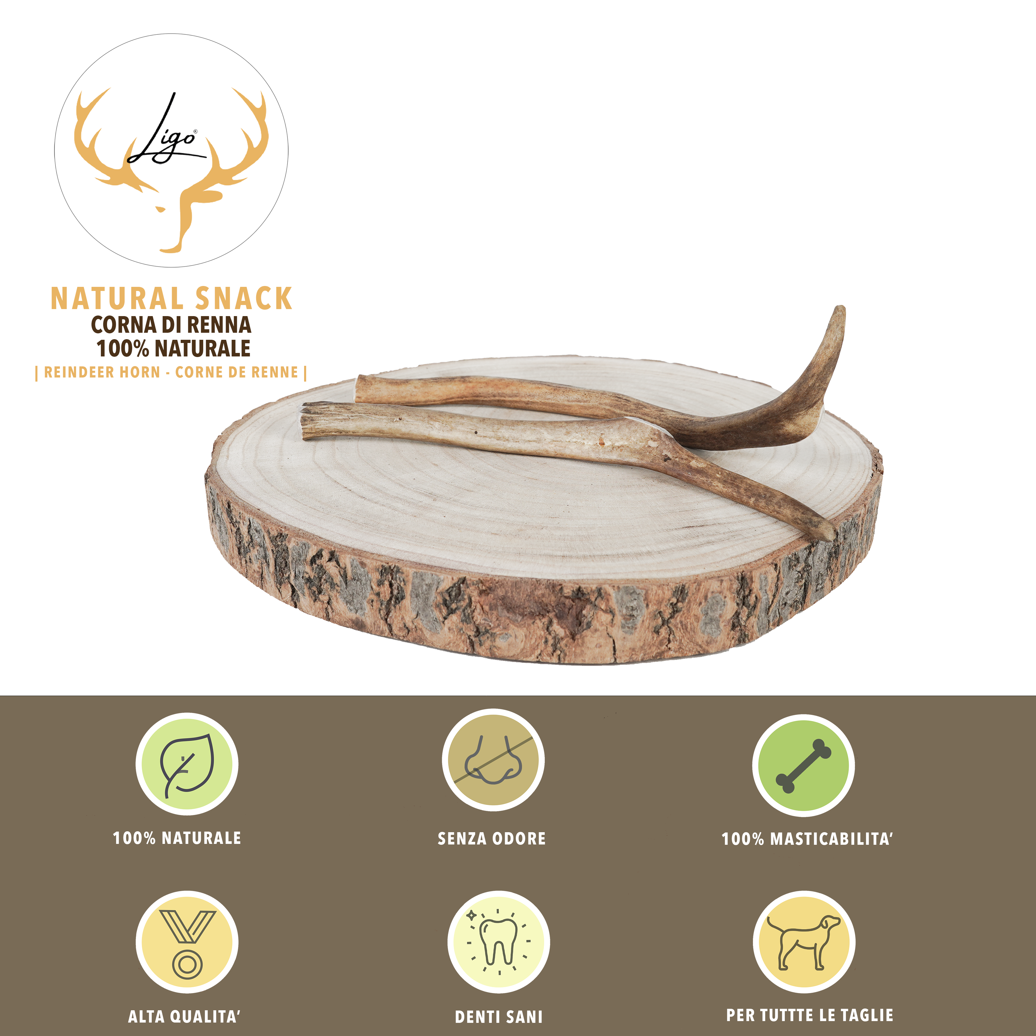 Una fonte naturale di calcio, fosforo, manganese e zinco. Le corna di renna da masticare costituiscono un esercizio perfetto per la formazione di ossa e denti nel tuo cane.