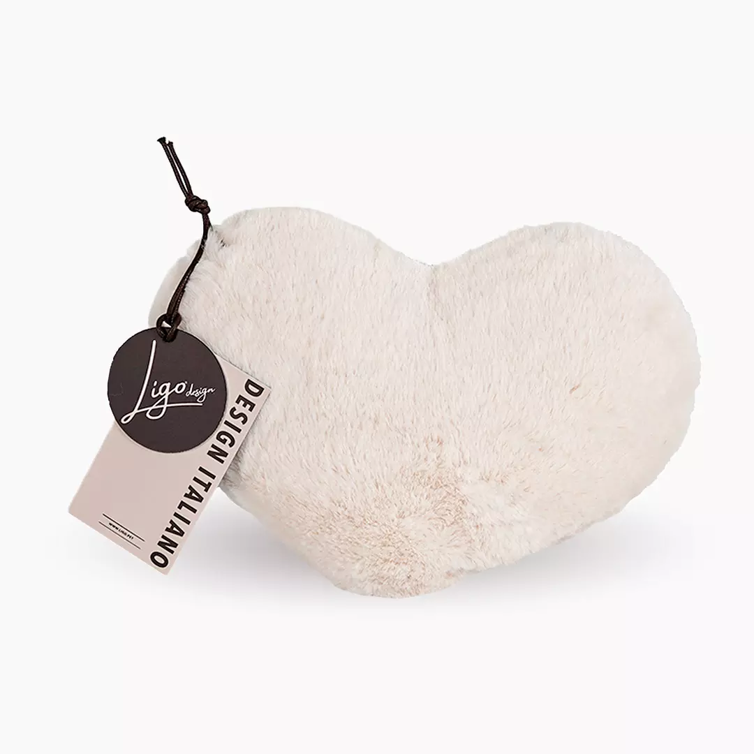 Simpatico peluche/cuscino di piccole dimensioni a forma di cuore di colore beige. Pensato anche come elegante accessorio per le cucce della linea Winter.