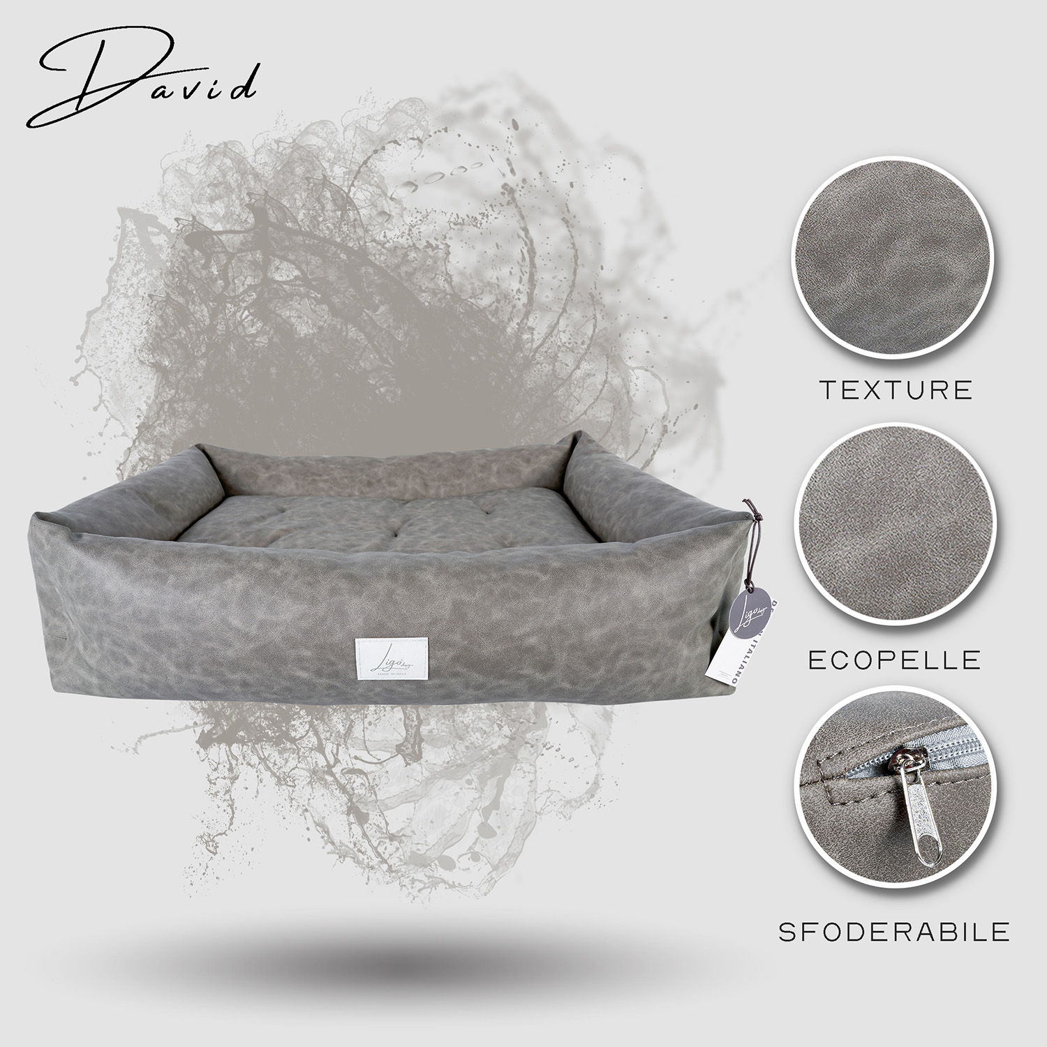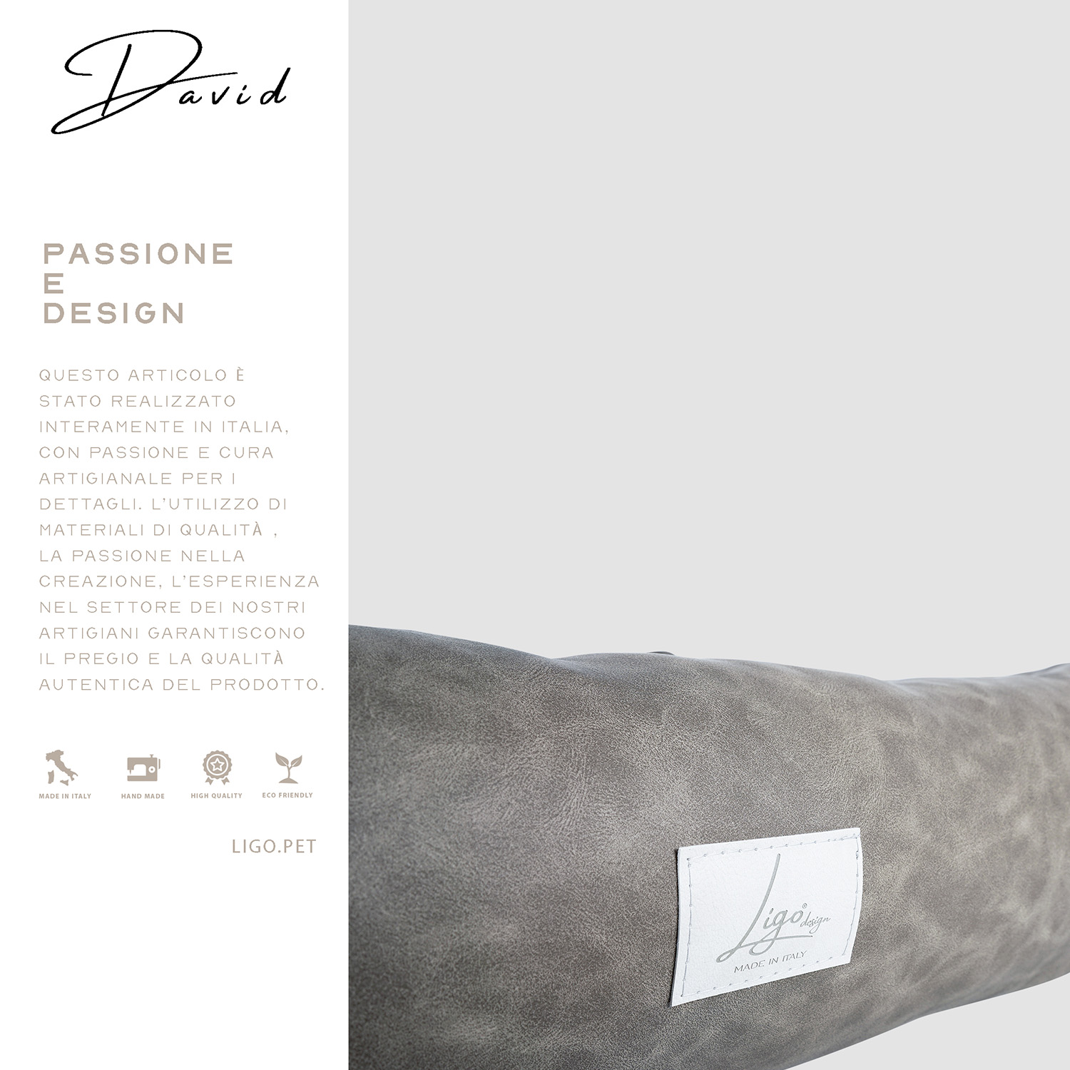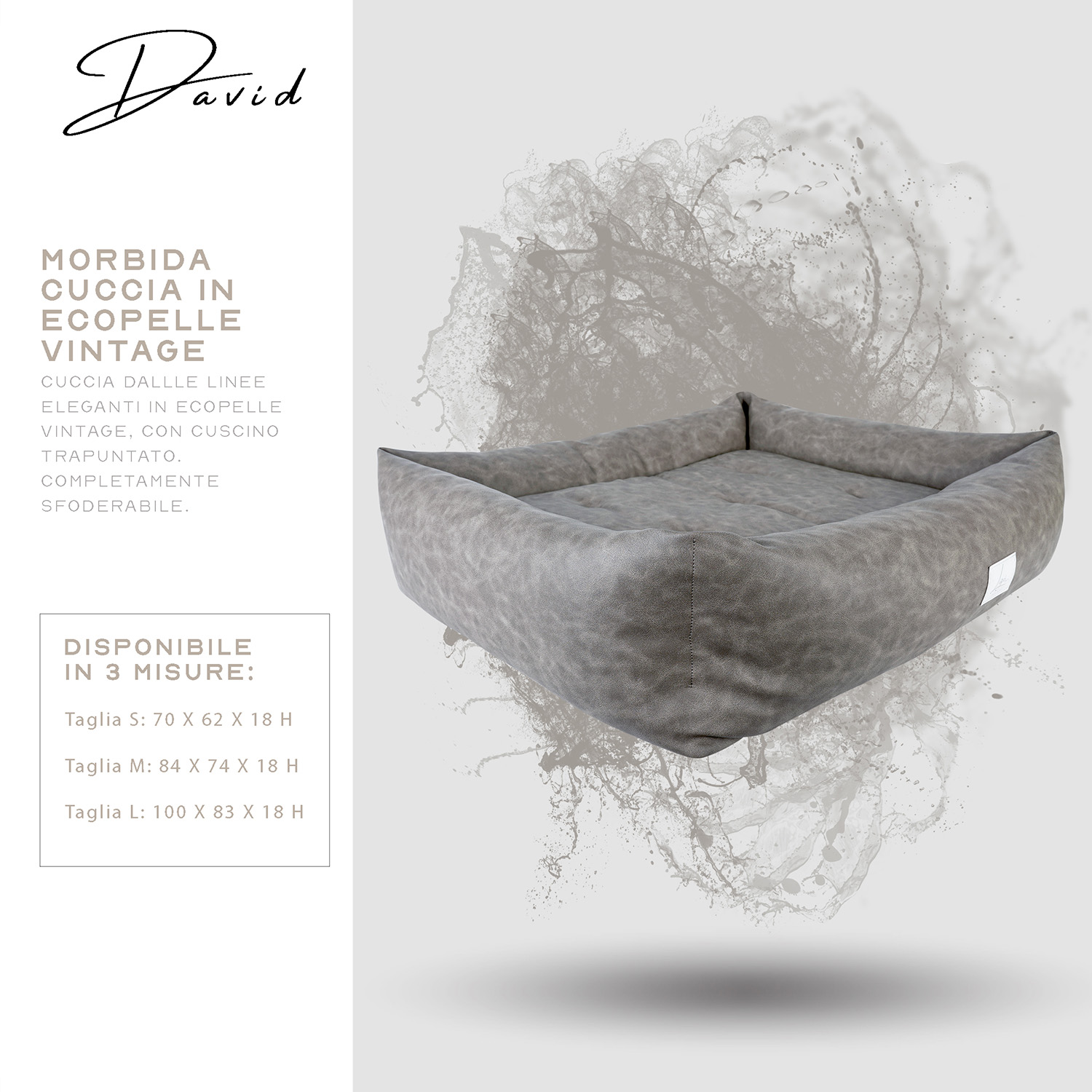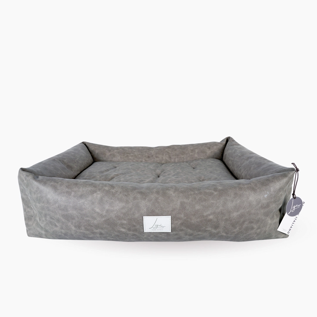Cuccia elegante con le sue linee si fonde completamente con l’arredamento di casa. Il cuscino superiore di questa cuccia è composto da morbida gommapiuma, rivestito da una fodera in eco pelle su cui è cucito uno strato di ovatta, rendendo la cuccia ideale per cani di taglia grande. Infatti la speciale trapuntatura del cuscino fa si che la forma, e la morbidezza, siano mantenute nel tempo.