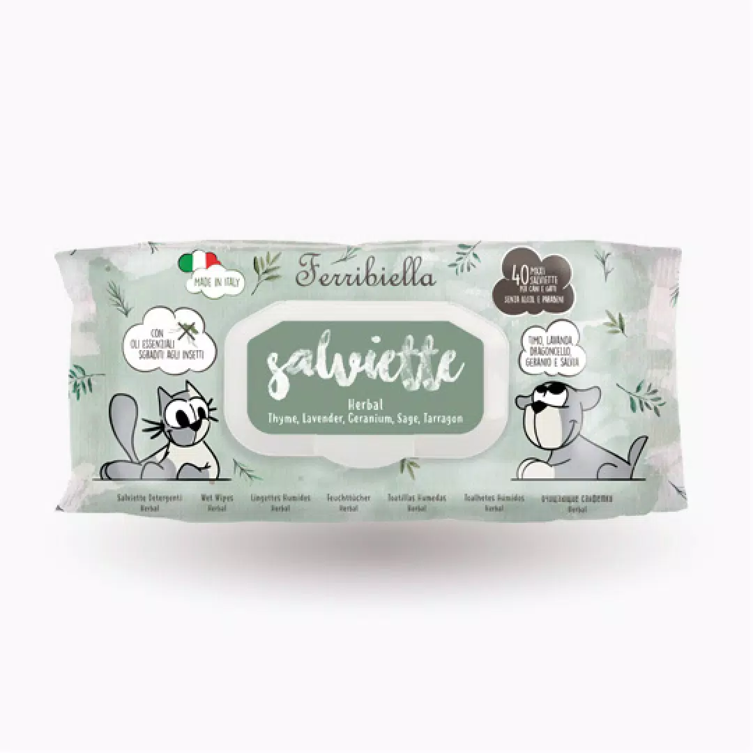Le salviette igieniche Ferribiella herbal, studiate per la perfetta igiene quotidiana del tuo cane, gatto o cucciolo. Contiene oli essenziali sgraditi agli insetti.