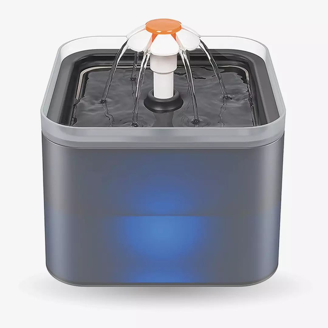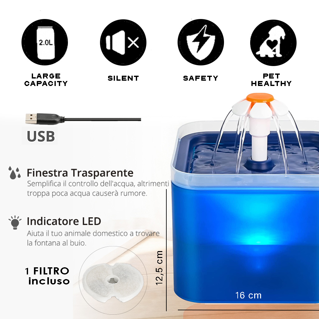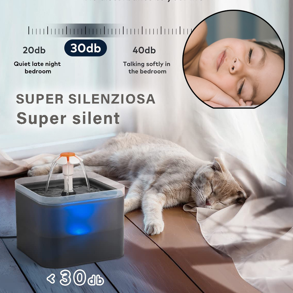 Un’oasi di benessere per felini: fontanella con filtro multiplo, flusso d’acqua irresistibile, alimentazione USB, acqua purificata ai carboni attivi, luce a led notturna e silenziosità assoluta.