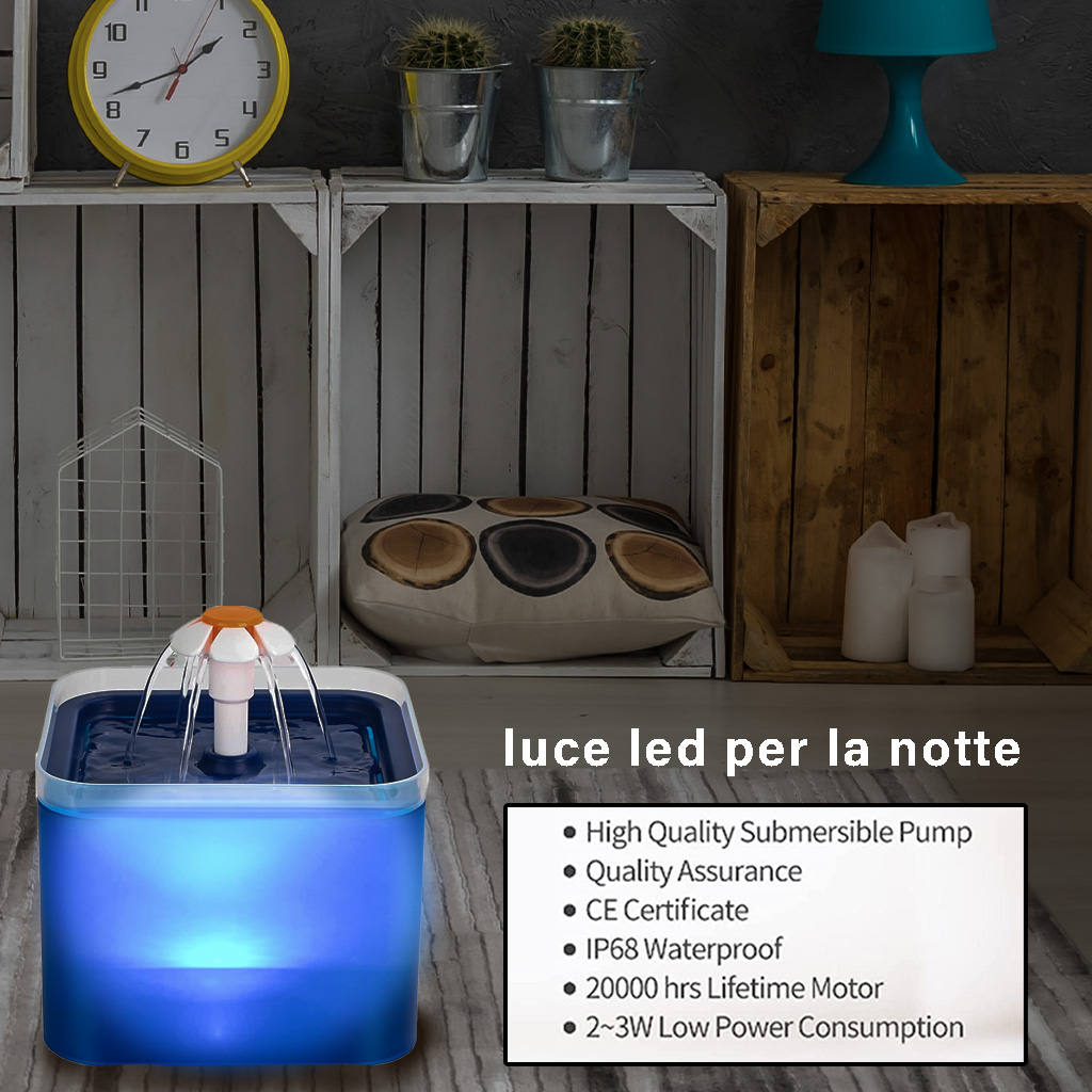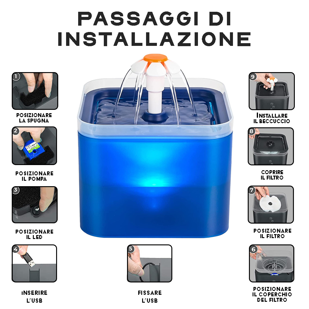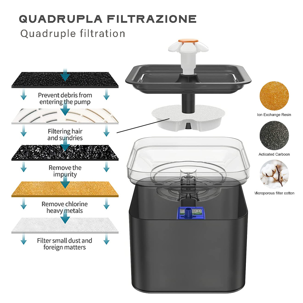 • La fontana è dotata di un filtro multiplo per rimuovere sporco, particelle di cibo e impurità.