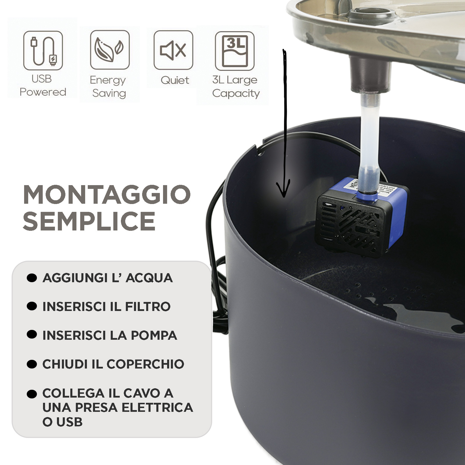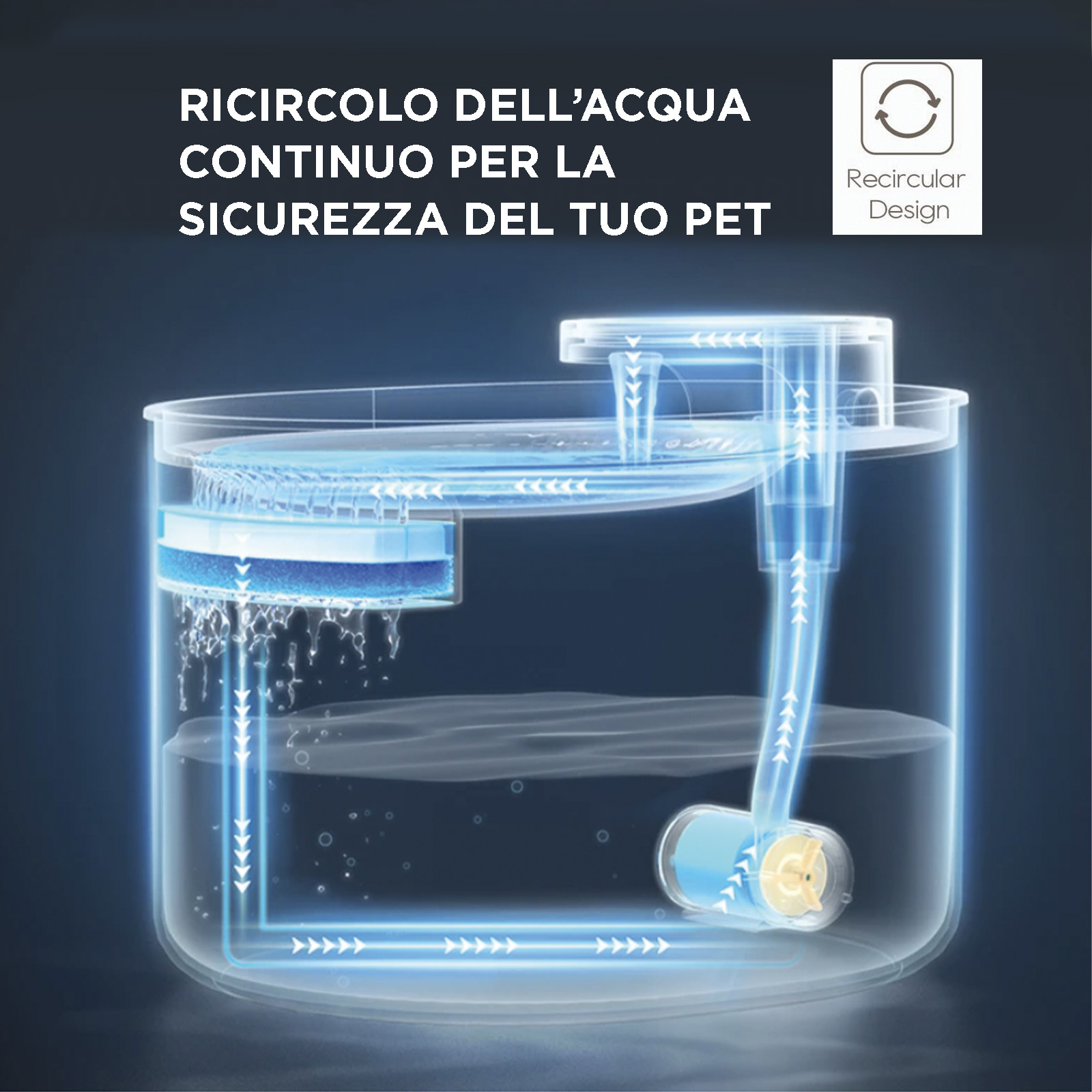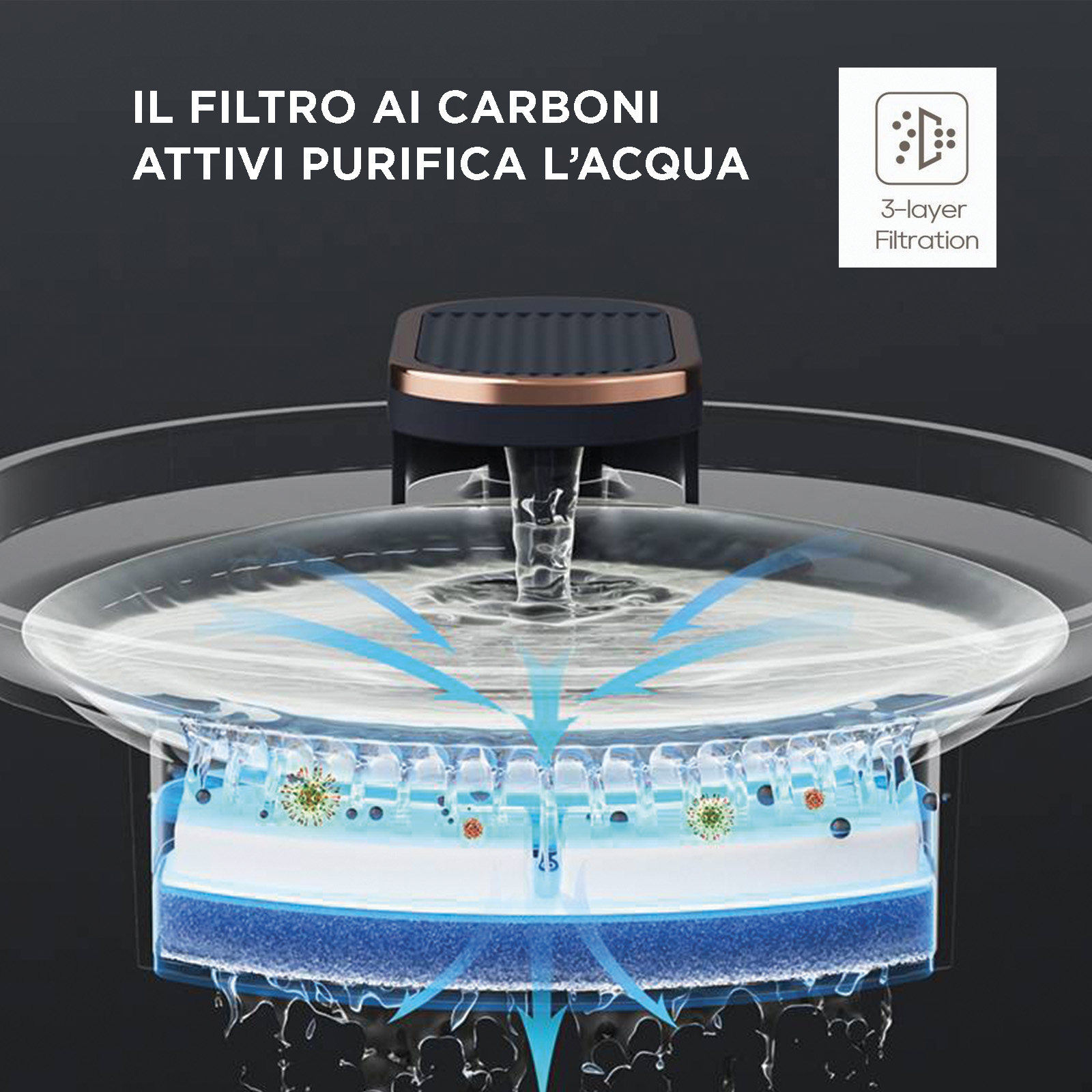 • La fontana è dotata di un filtro multiplo per rimuovere sporco, particelle di cibo e impurità.