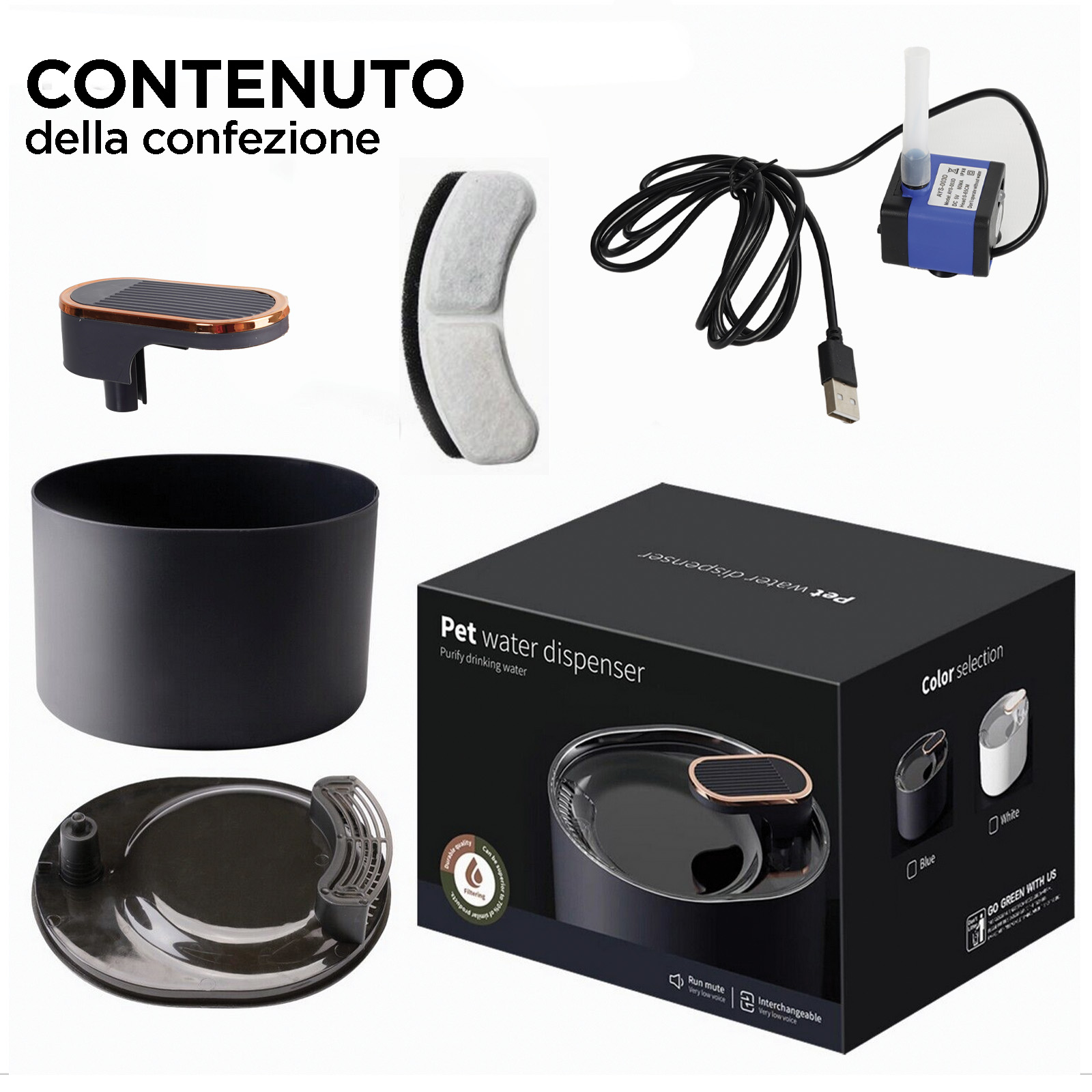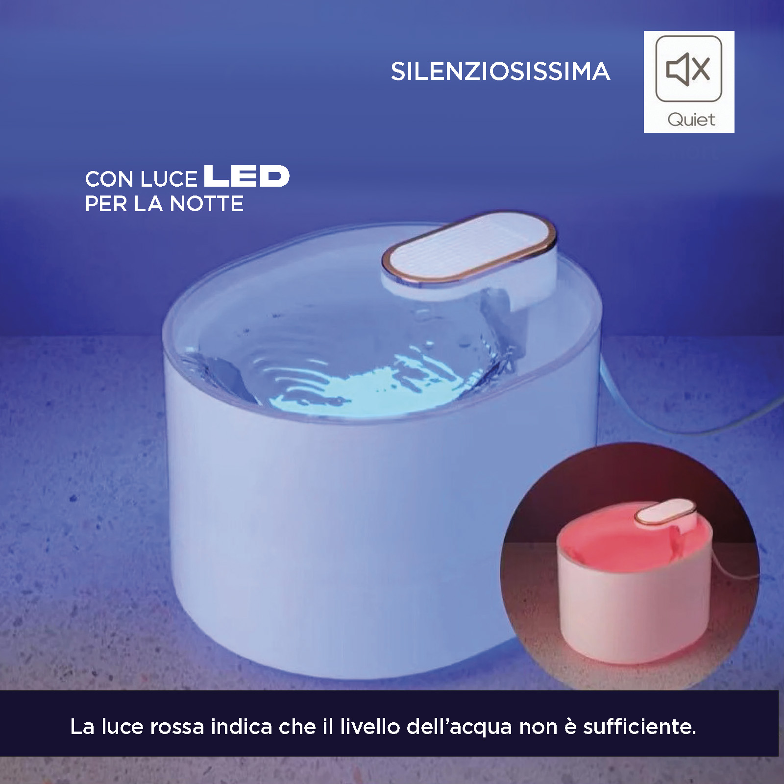 Un’oasi di benessere per cani e gatti: fontanella con filtro multiplo, flusso d’acqua irresistibile, alimentazione USB, acqua purificata ai carboni attivi, luce a led notturna e silenziosità assoluta.