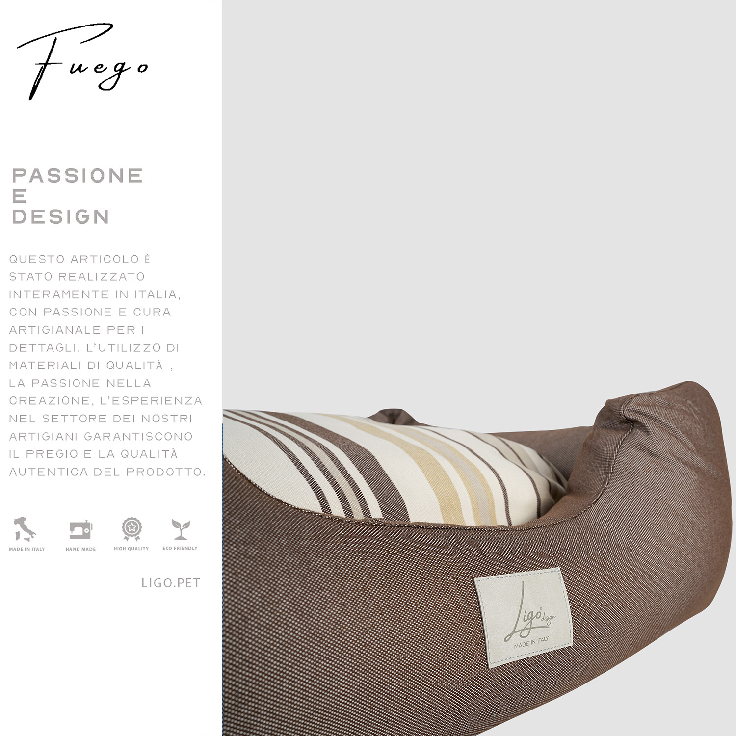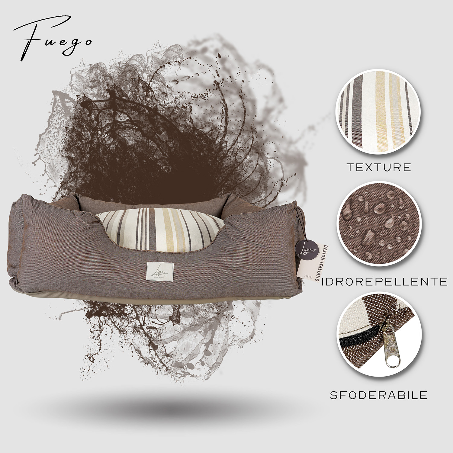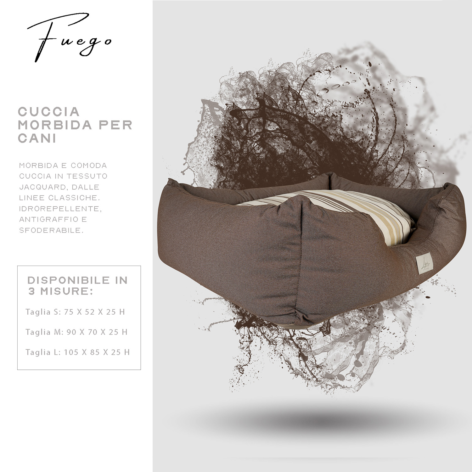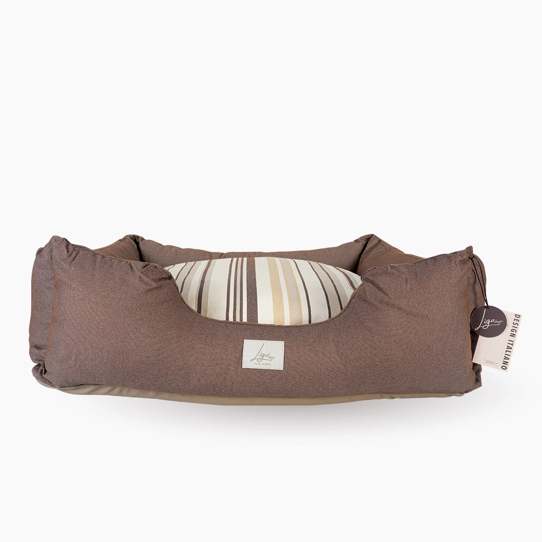 Cuccia con tessuto in Jacquard, composto da policotone, una miscela di tessuti più resistente del cotone ma più naturale del poliestere, più gradevole, sicuro e comodo.