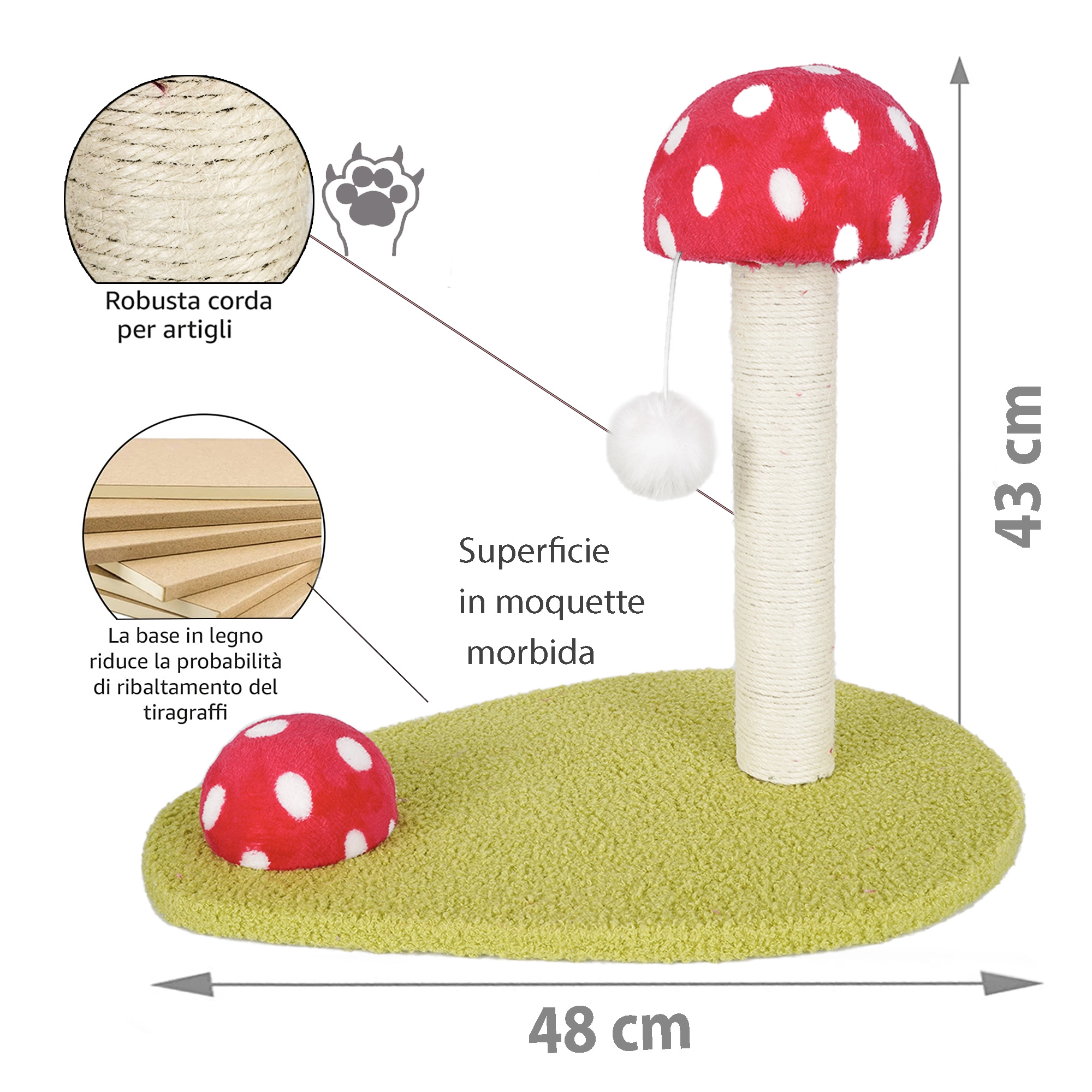 Tiragraffi con base arrotondata, palo in juta graffiabile e pallina in peluche. La base è rivestita in moquette per la sicurezza delle zampe.