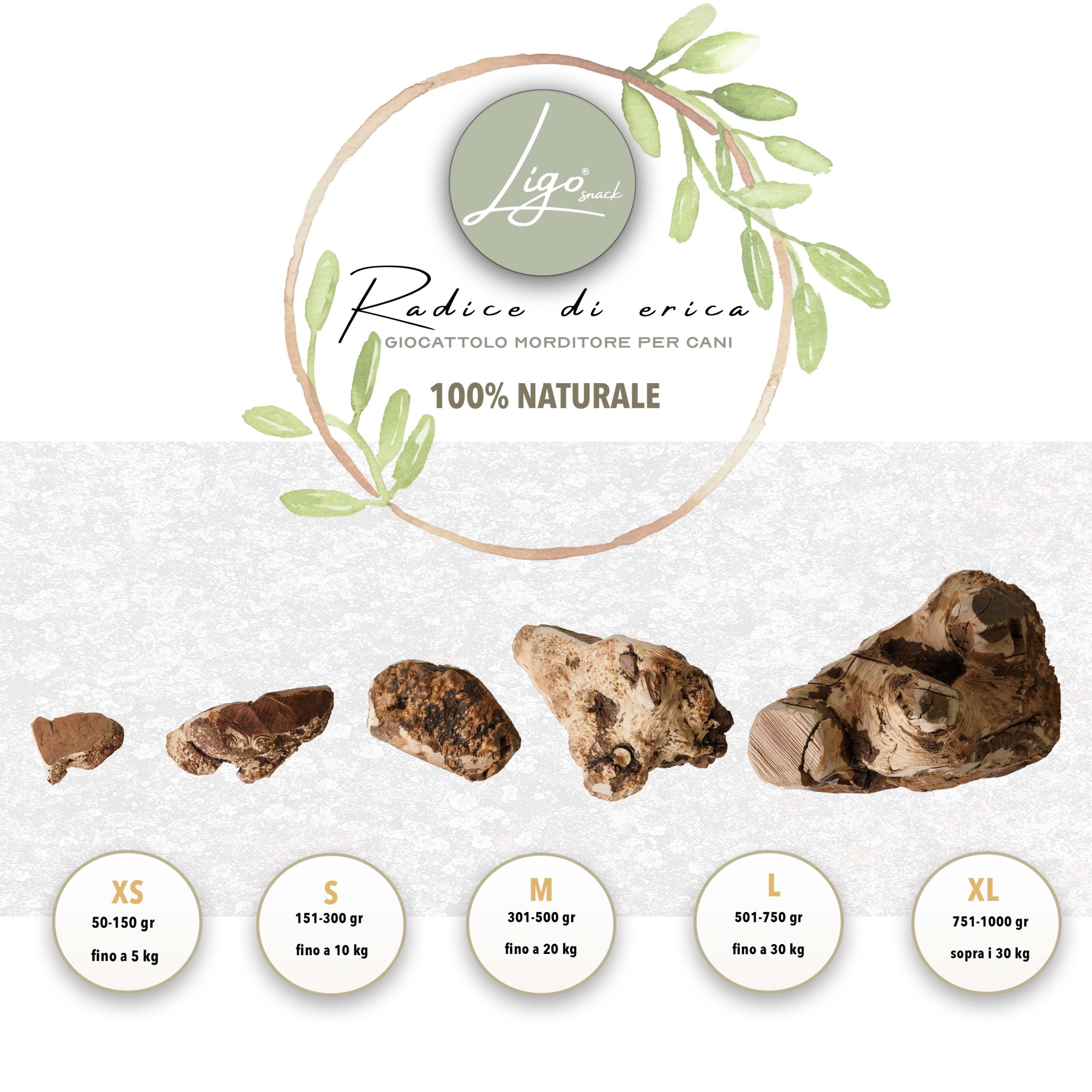 Radice di erica, gioco masticativo naturale al 100%. Adatto per cani di qualsiasi dimensioni. Ingrediente aggiunto: olio extra vergine di oliva.