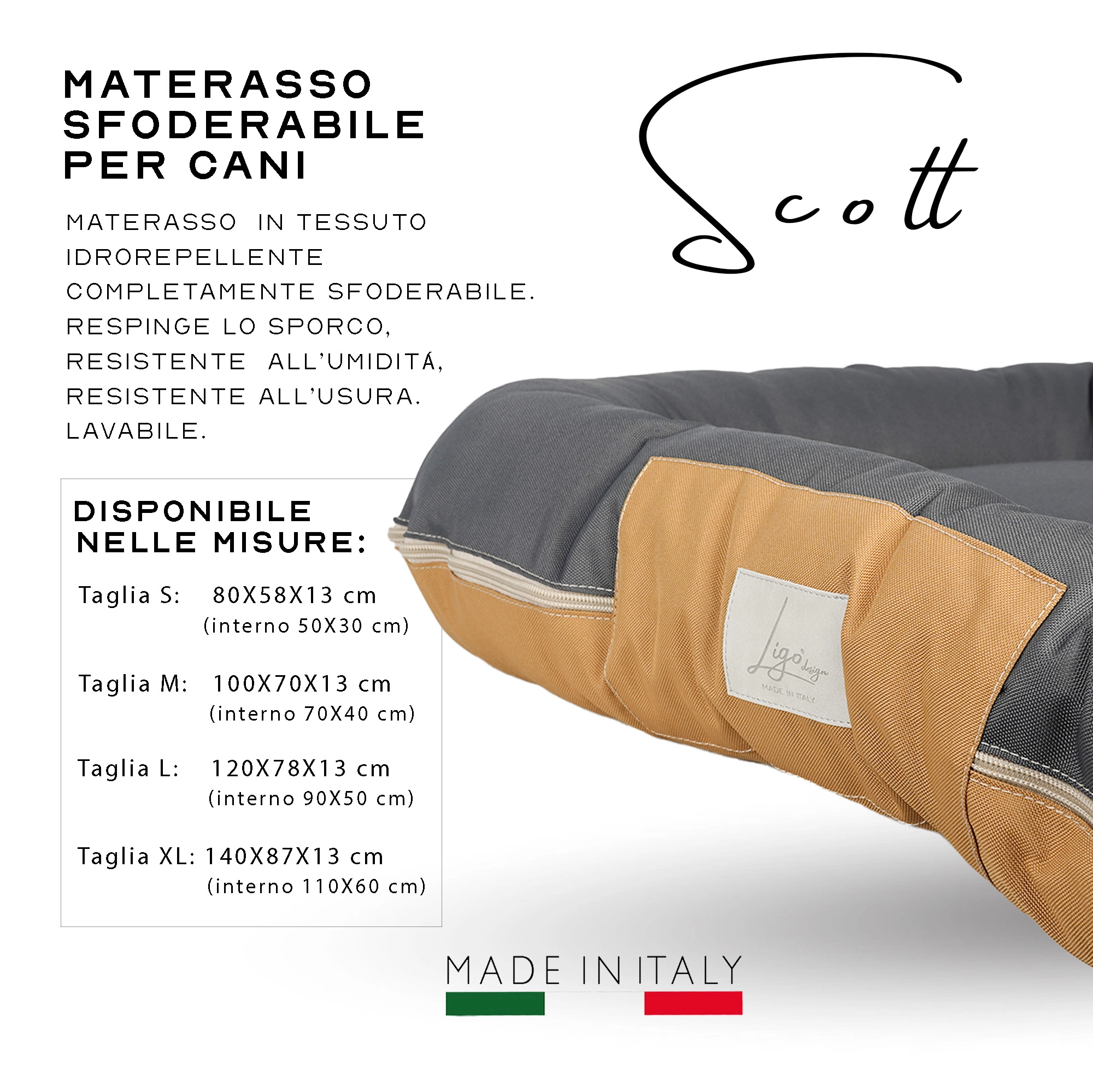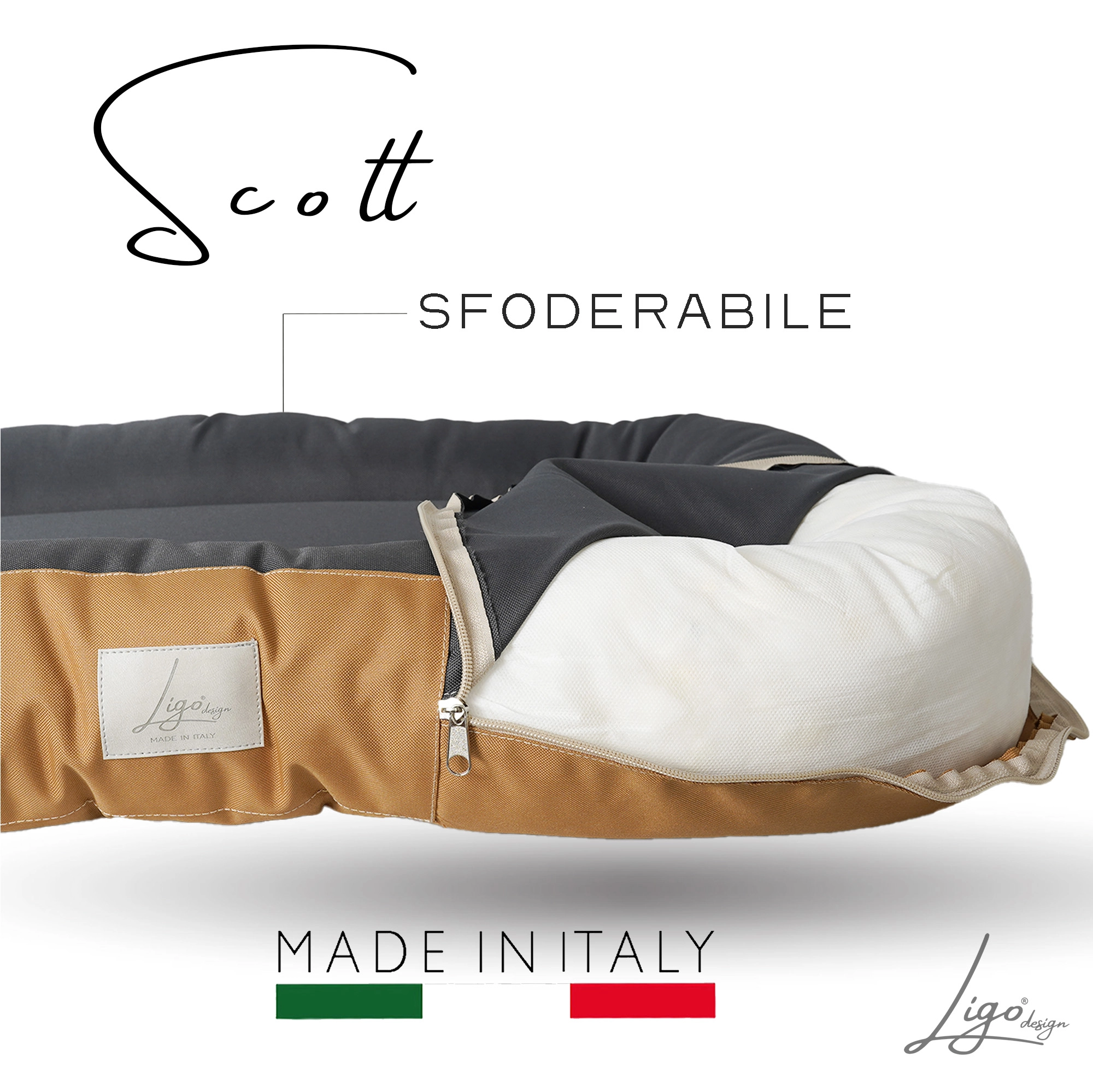 • Sfoderabile; 3 zip, due sul lato esterno e una sul retro del cuscino interno