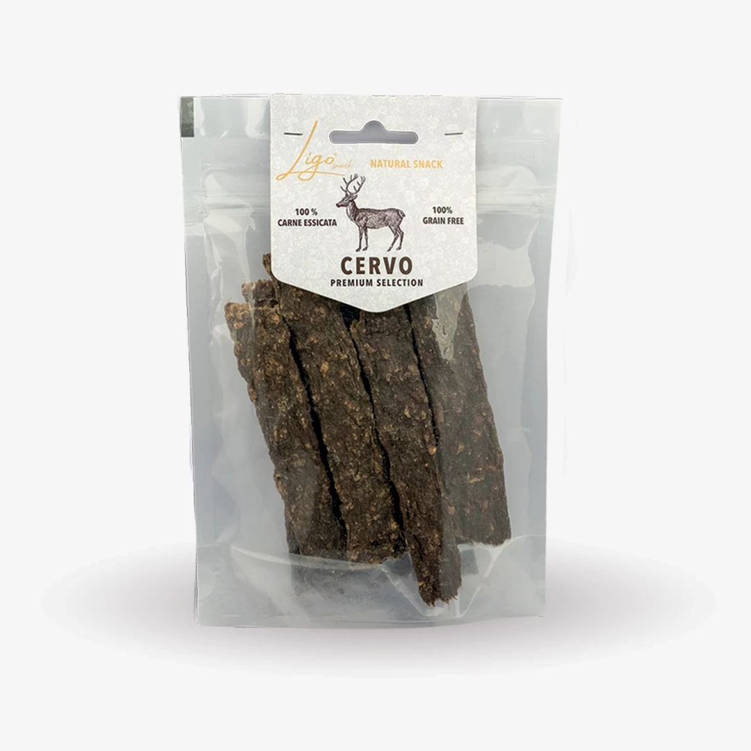 Strisce composte al 100% di carne naturale di cervo essiccata.