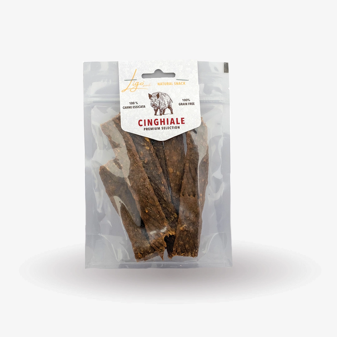 Strisce composte al 100% di carne naturale di cinghiale essiccata.