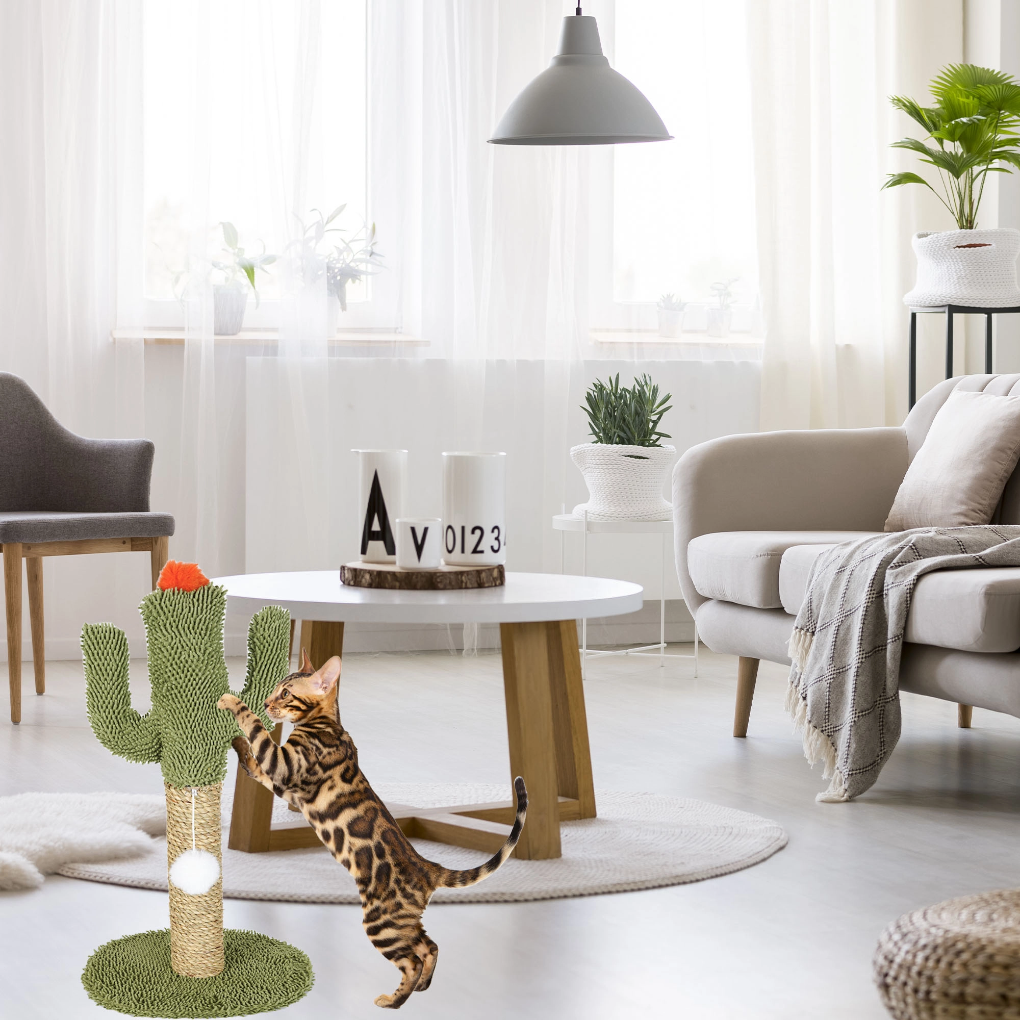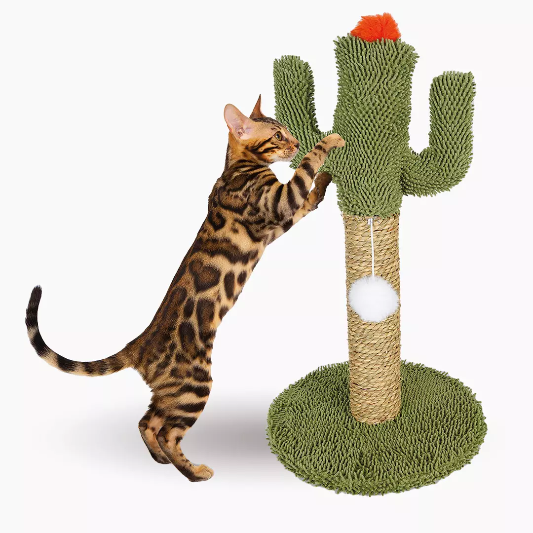 Tiragraffi a base rotonda con palo in juta graffiabile e pallina in peluche. La base è rivestita in moquette per la sicurezza delle zampe.