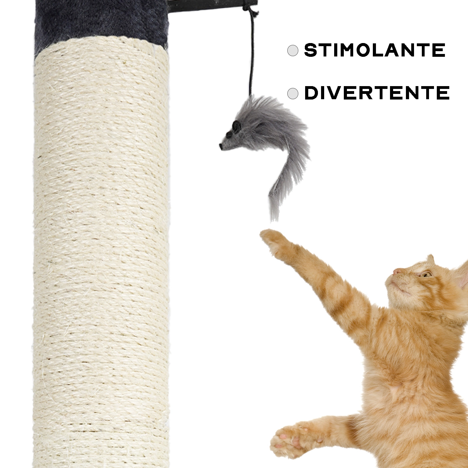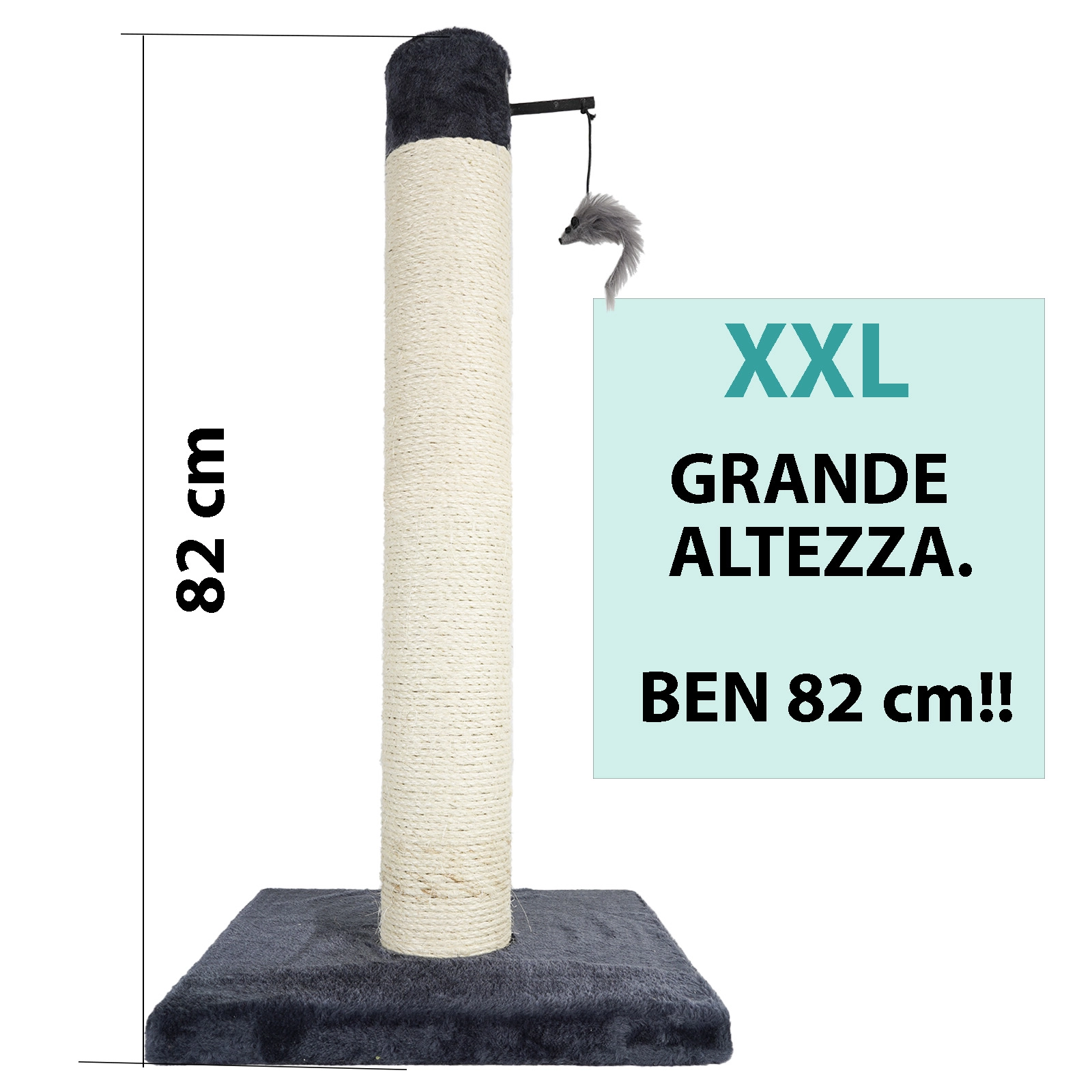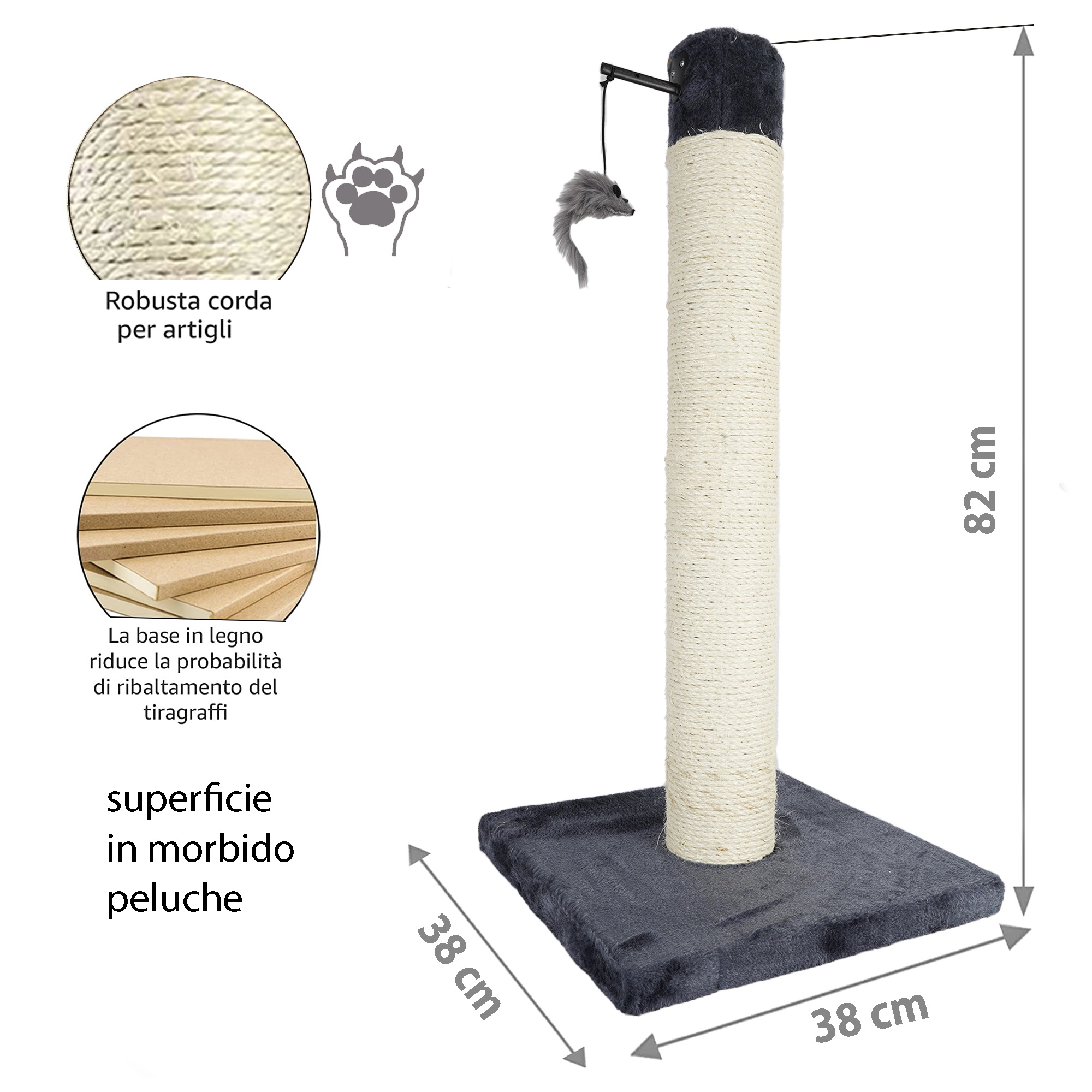 Tiragraffi xxl a base quadrata con palo in juta graffiabile e animaletto sospeso.