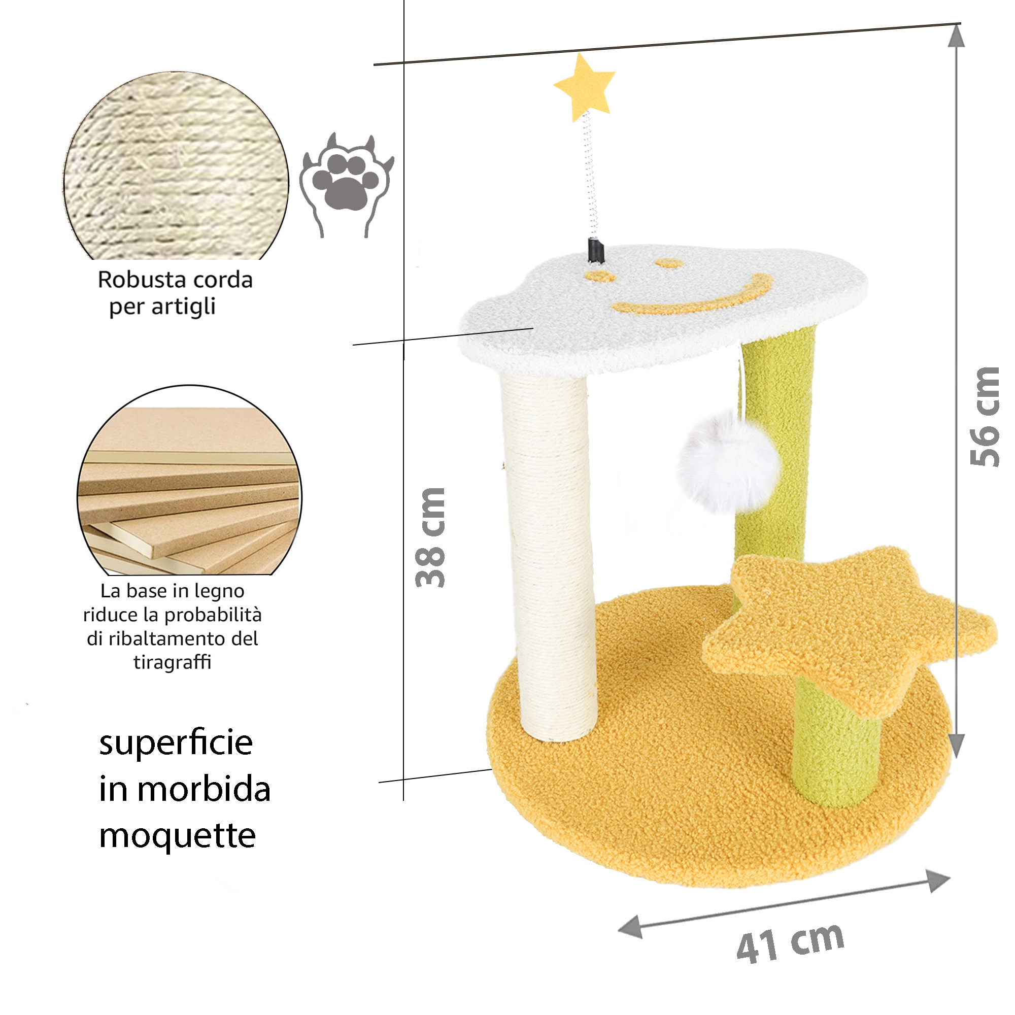 Tiragraffi a base rotonda con palo in juta graffiabile e pallina in peluche. La base è rivestita in moquette per la sicurezza delle zampe. Le sue caratteristiche sono: