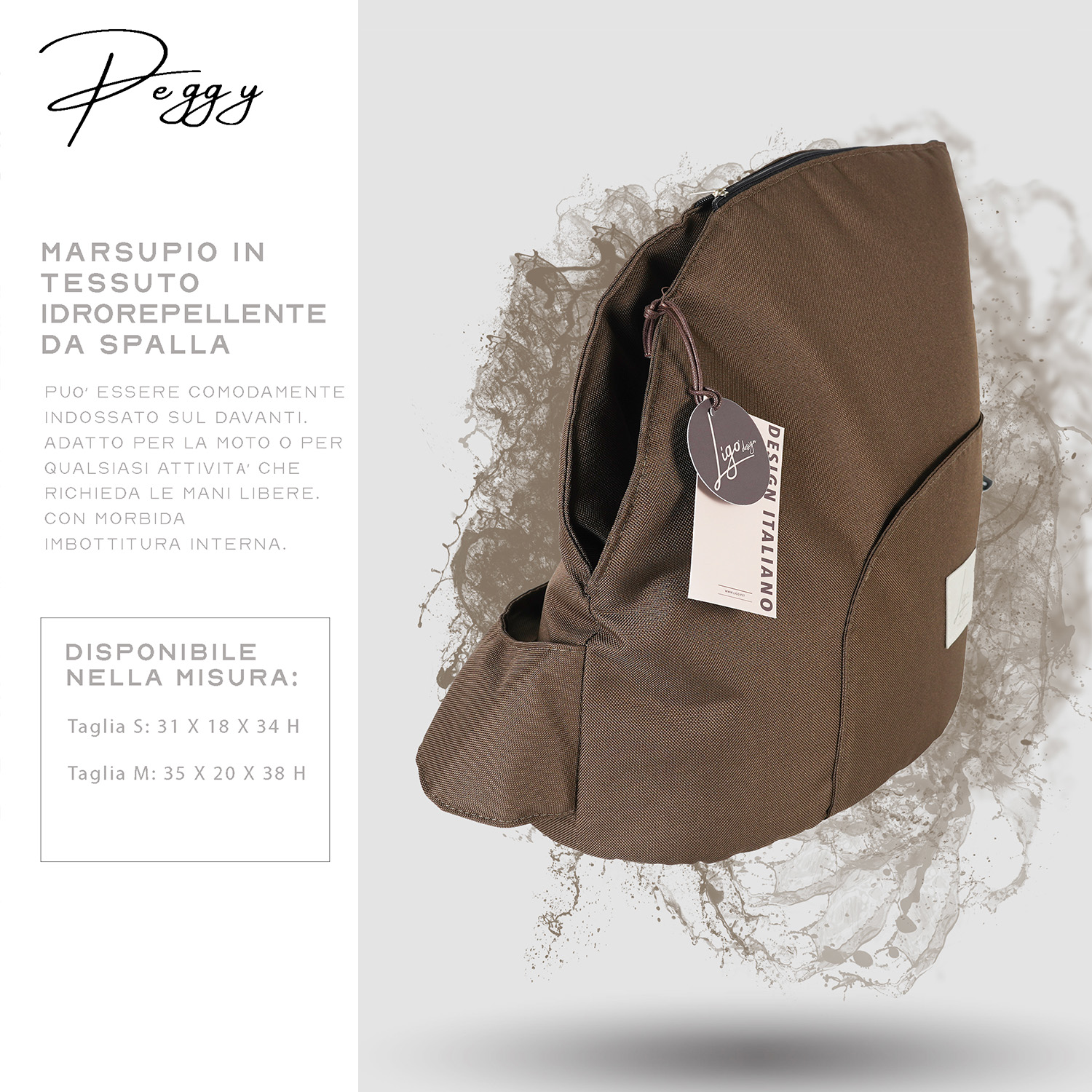 Robusto marsupio in tessuto idrorepellente da spalla, con tracolla regolabile. Può essere comodamente indossato sul davanti.